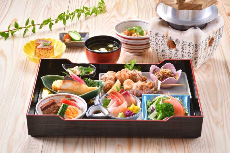 |  | 松花堂御膳釜めしは炊きあがりに30分程お時間頂きます。 ご来店時間に合わせて炊きあがりご希望の際はお申しつけください。 | 白米 2,800円(税込3,080円) 鶏釜めし 3,200円(税込3,520円) |