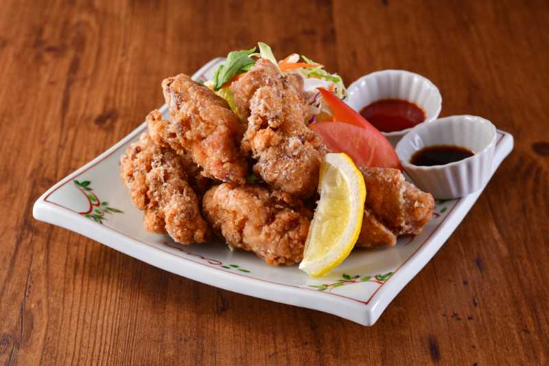 |  | 若鶏竜田揚モモ肉に醤油ベースの下味をつけて揚げました。 2種のソース付 |