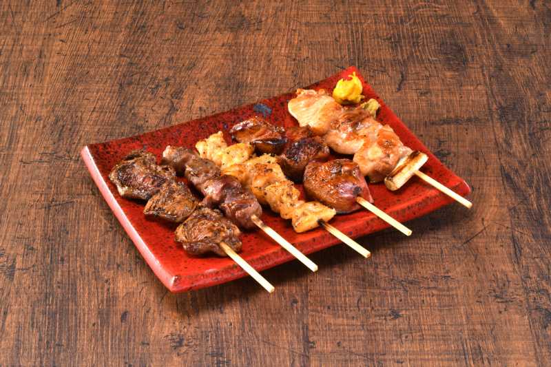 |  | おまかせ串焼盛り合わせ1人前5本(肉ねぎ・砂肝・レバー・皮・ハツ) さっぱり塩味、鳥安秘伝タレ味 |
